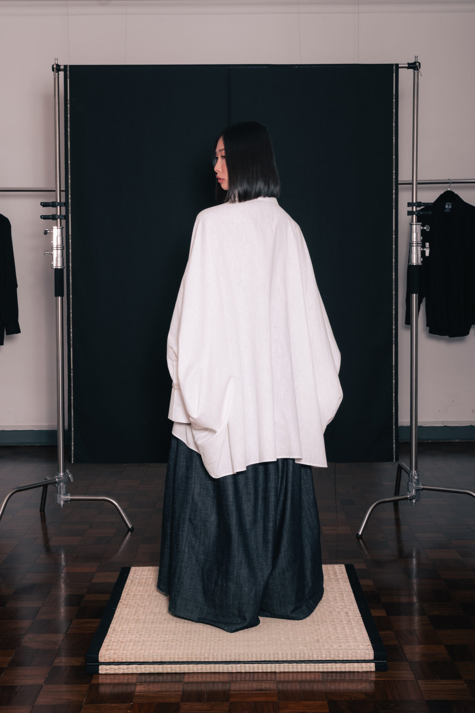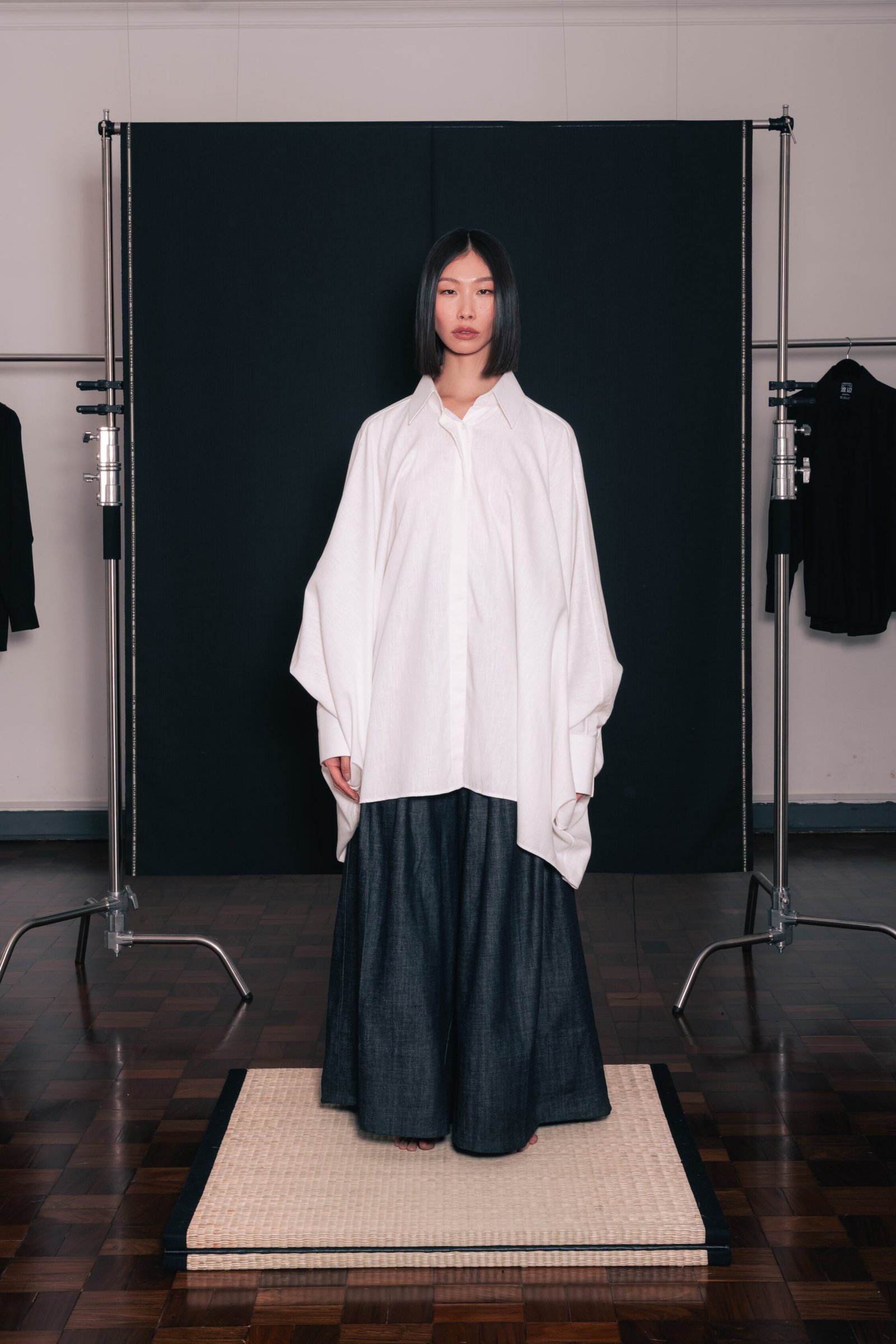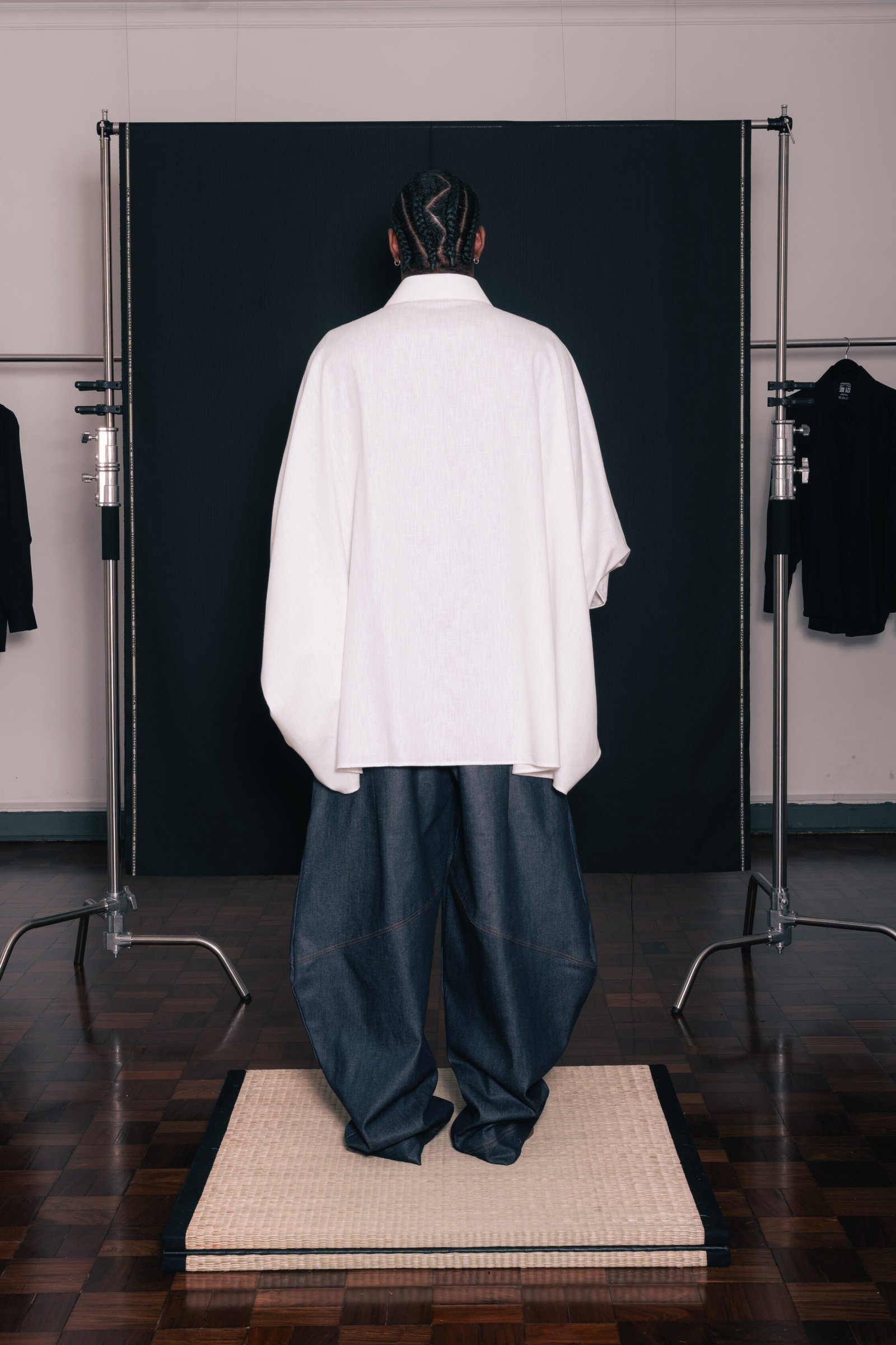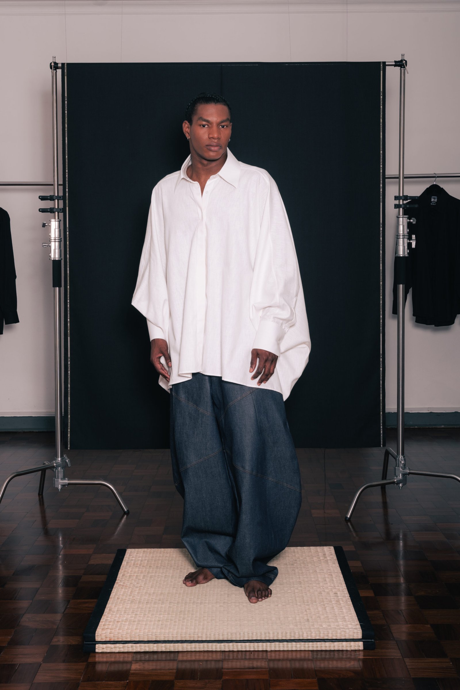 Camisa oversized com base na modelagem clássica de alfaiataria, reinterpretada a partir de recortes frontais e traseiros que formam desenhos sutis na superfície. As linhas retas percorrem todo o comprimento da peça, revelando um trabalho de encaixe preciso na construção do tecido. Possui fechamento frontal por abotoamento e punhos finalizados com botões de resina reciclada, reforçando o compromisso com práticas mais sustentáveis.
