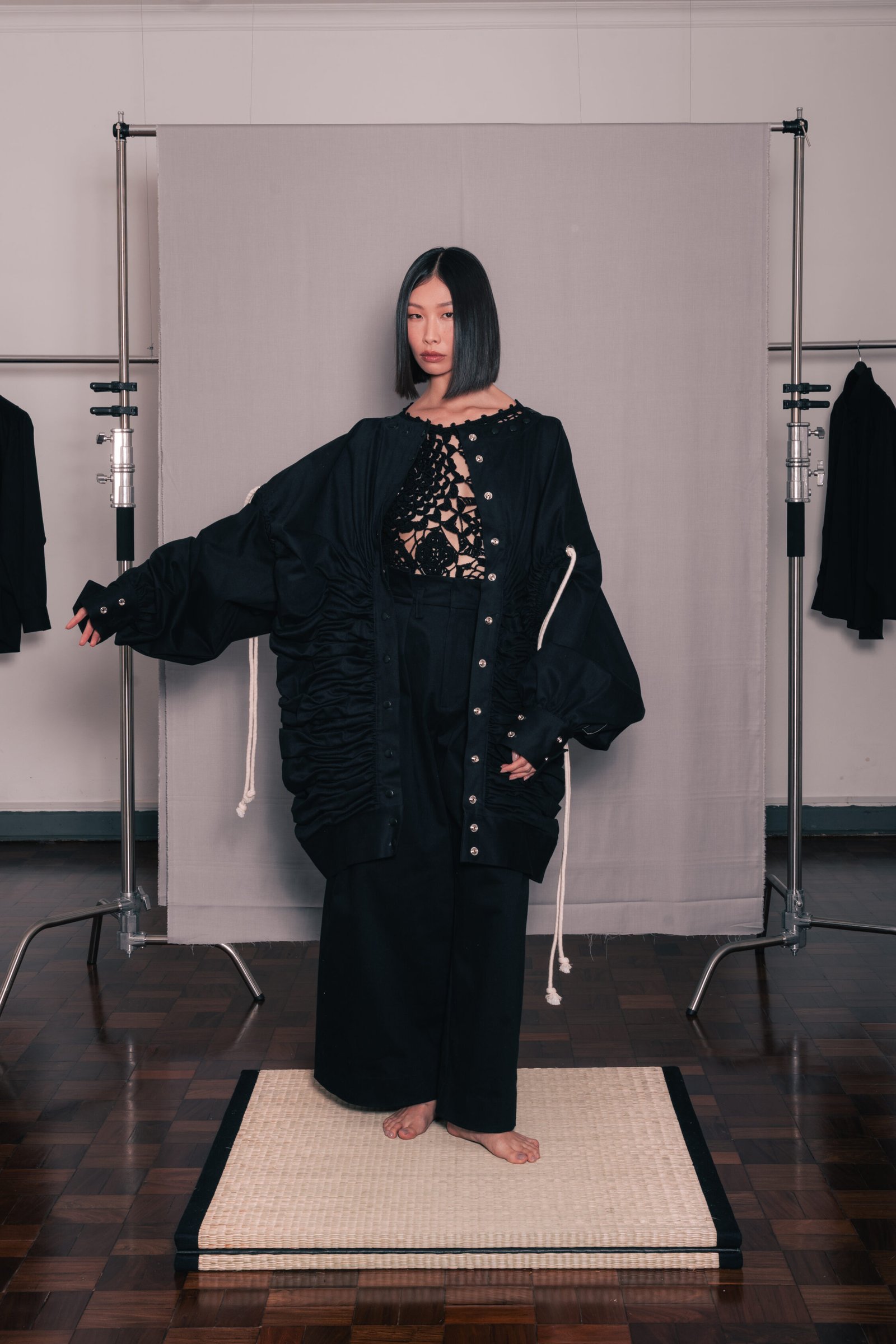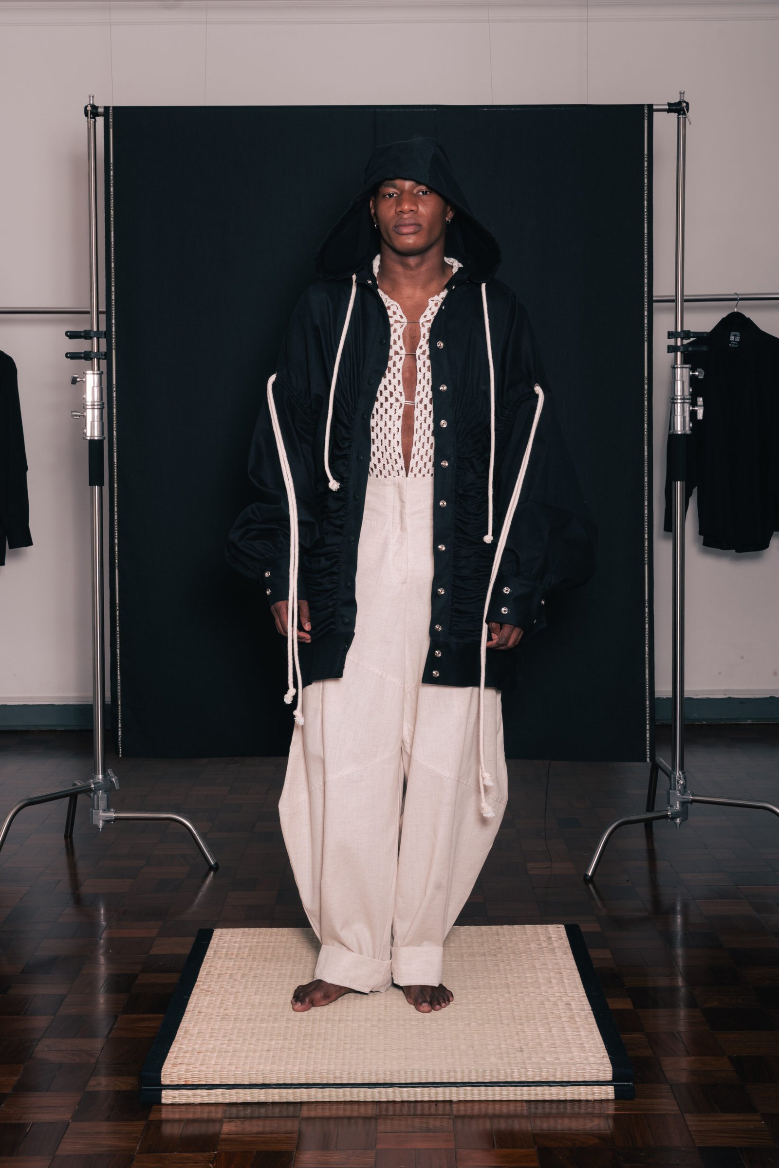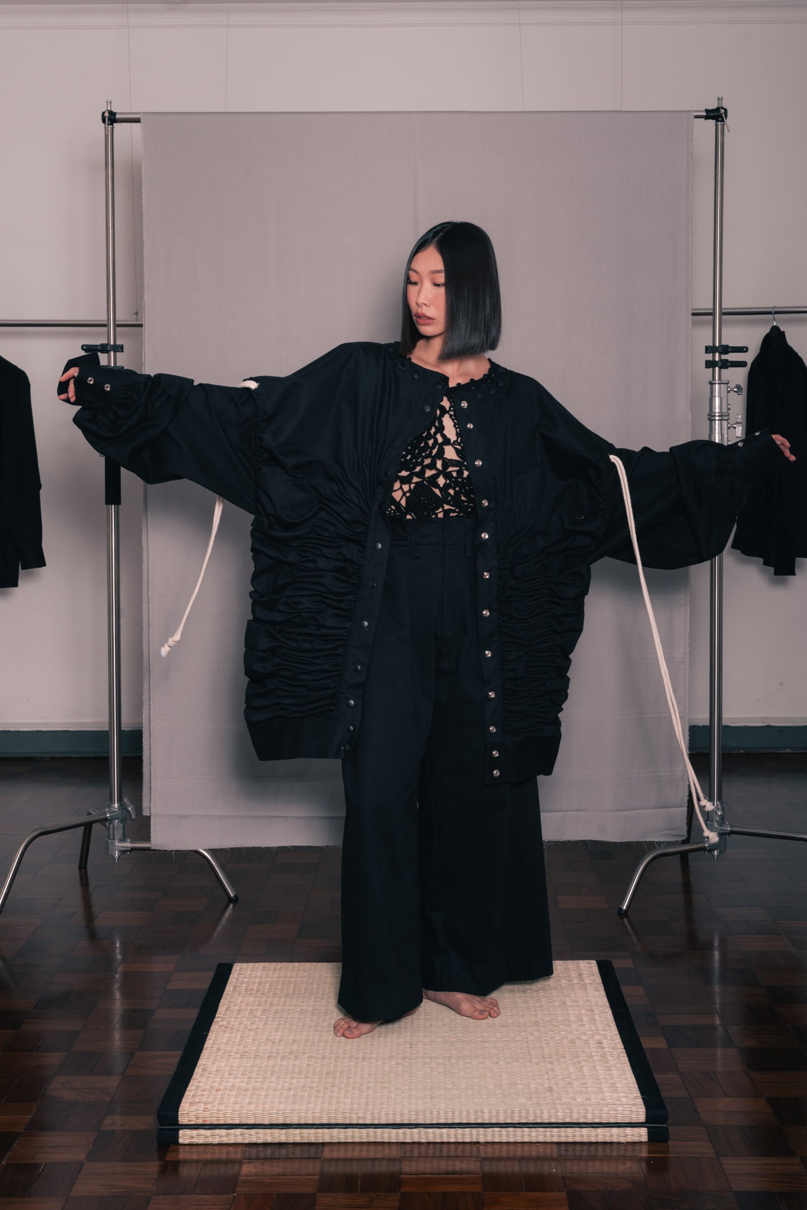 Casaco de modelagem ampla e alongada, com circunferência frontal franzida por um mecanismo de franzidor de cortina, formando um semicírculo que adiciona movimento e volume à peça. Acompanha gorro removível fixado por botões de pressão em níquel e cordões distribuídos pela peça que permitem ajustar os franzidos conforme a preferência, garantindo versatilidade no caimento e estilo.
