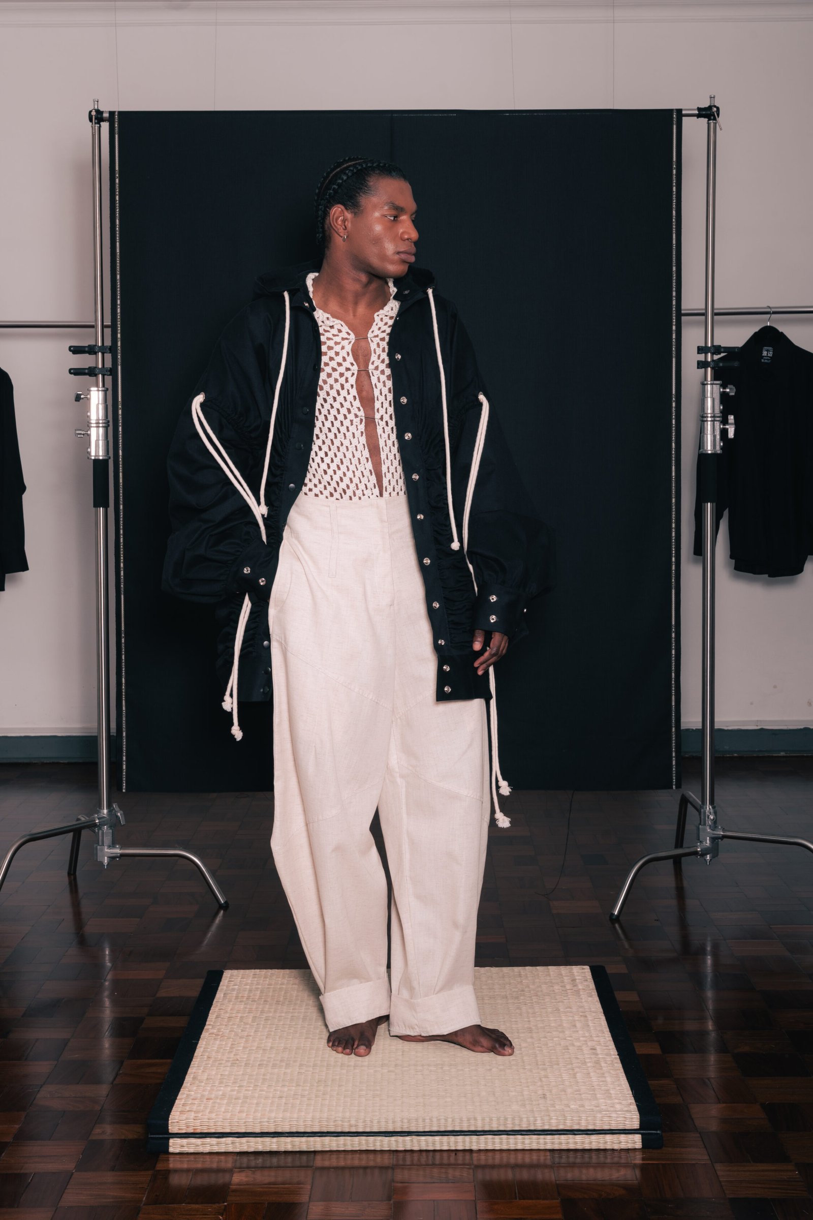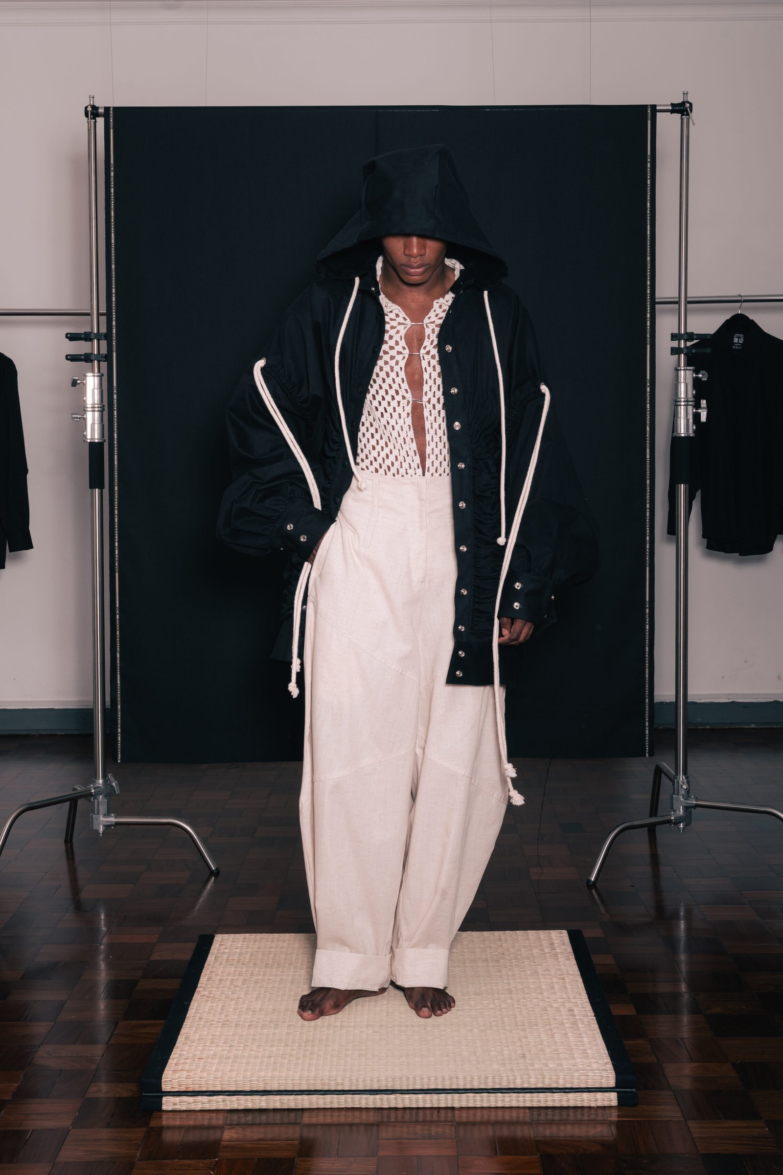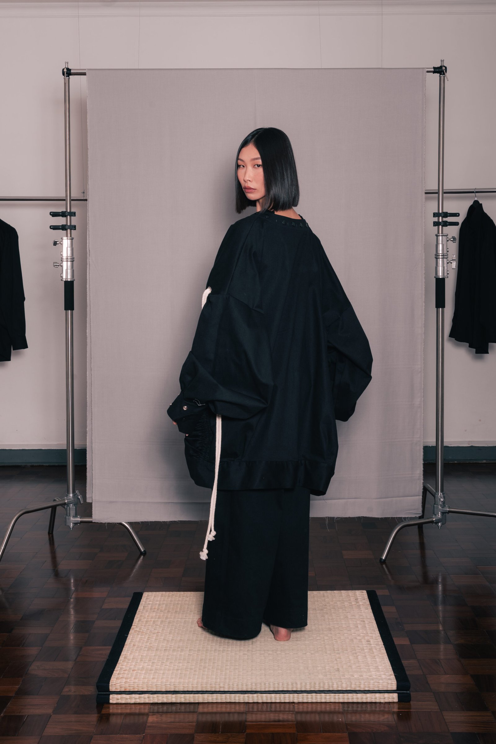 Casaco de modelagem ampla e alongada, com circunferência frontal franzida por um mecanismo de franzidor de cortina, formando um semicírculo que adiciona movimento e volume à peça. Acompanha gorro removível fixado por botões de pressão em níquel e cordões distribuídos pela peça que permitem ajustar os franzidos conforme a preferência, garantindo versatilidade no caimento e estilo.