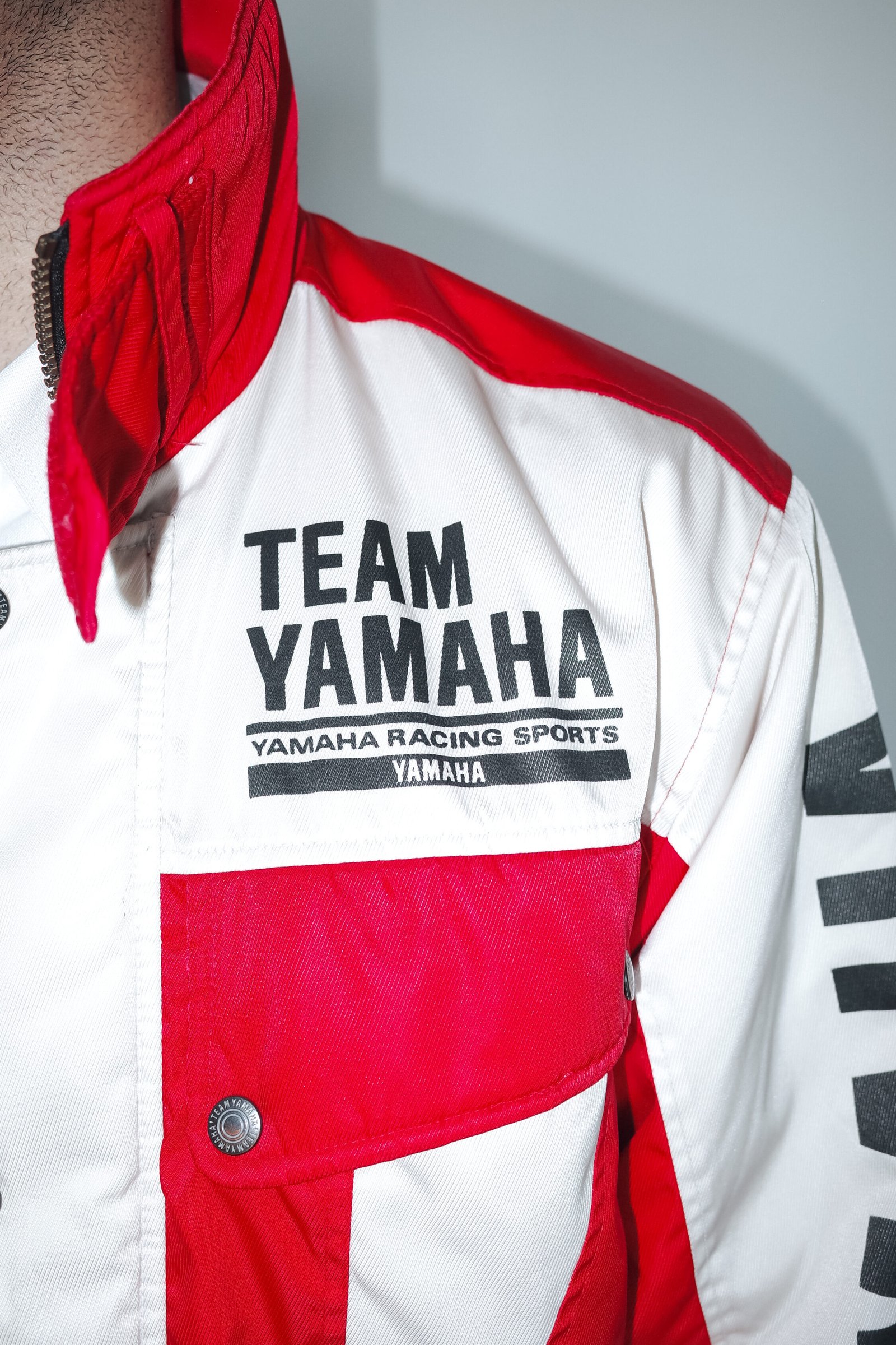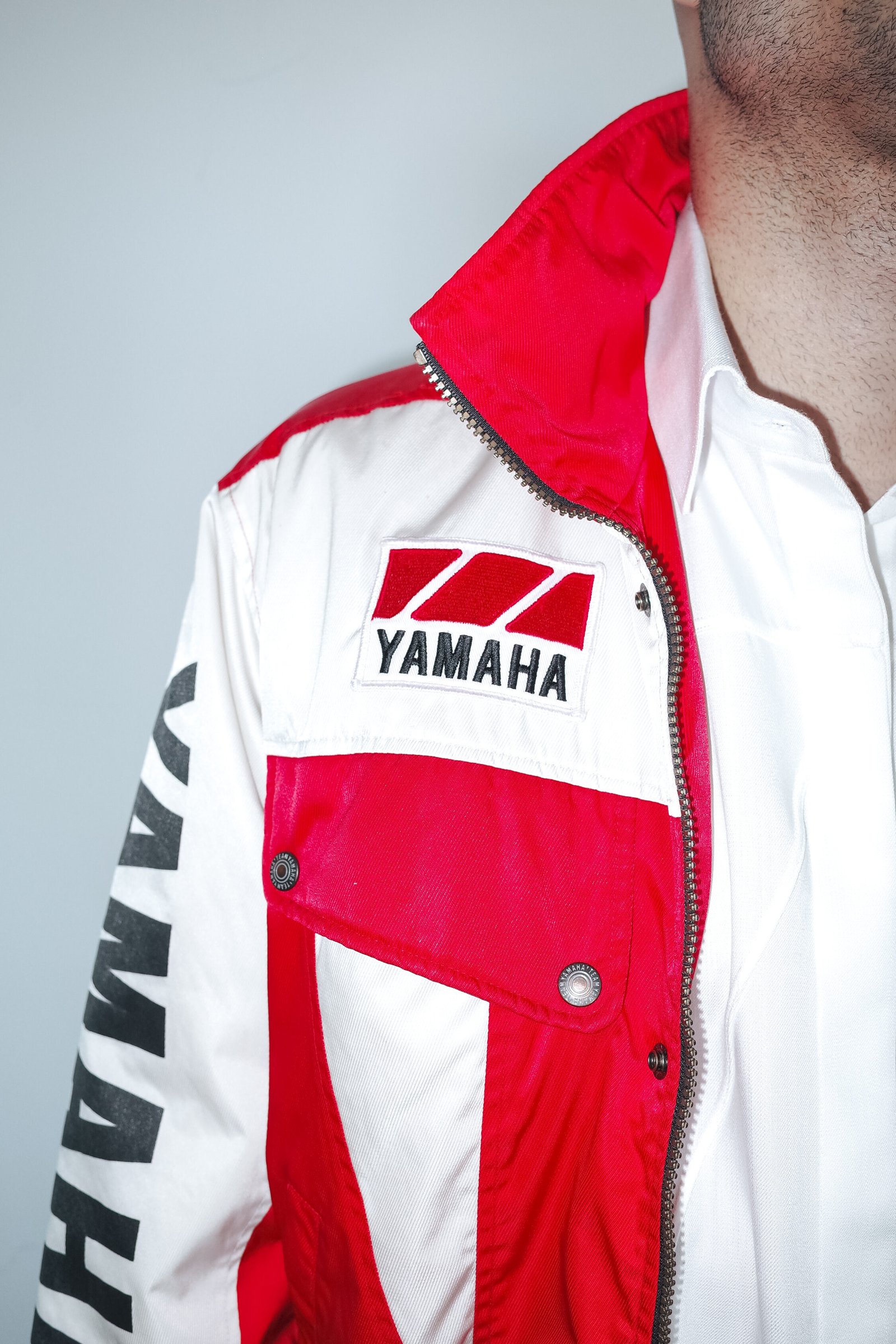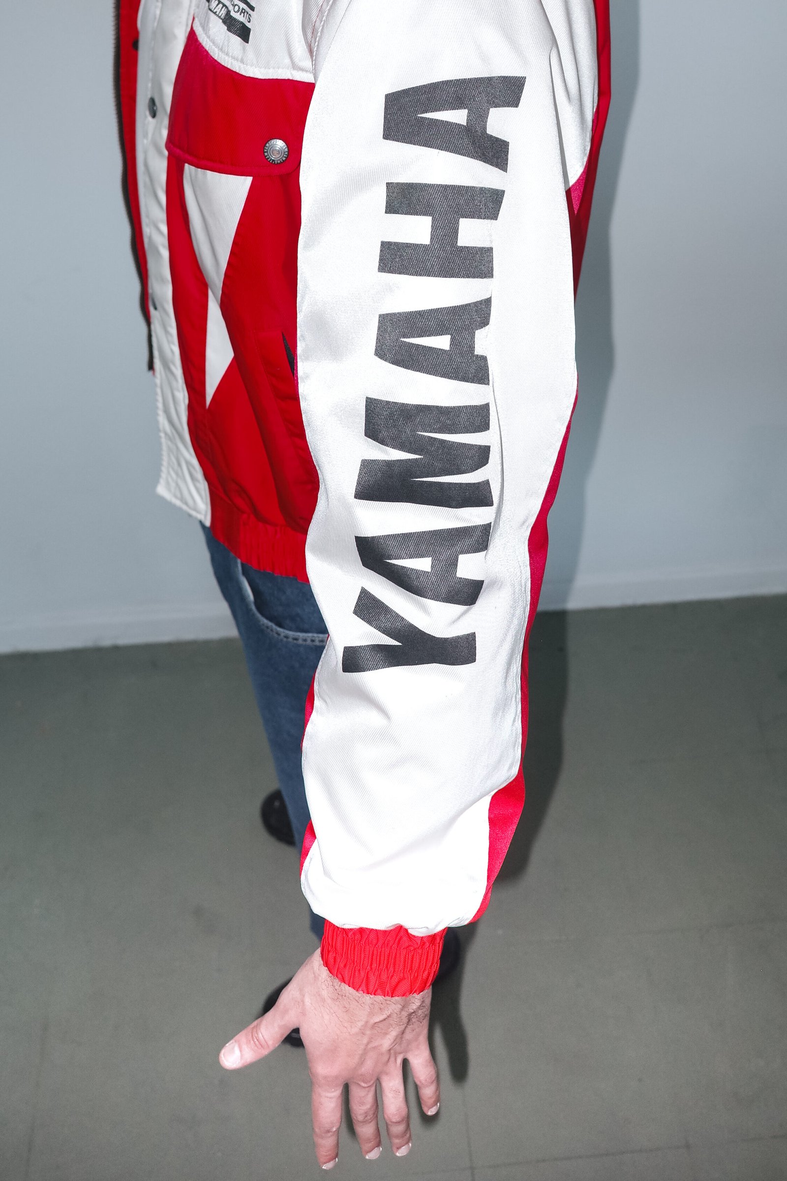 Jaqueta Yamaha com mix de tecidos em couro e sintéticos, nas cores branc e vermelho. Peça com modelagem de jaqueta motociclisram cin punho e barra em elástico. Forrada com cetim. Produto garimpado no Japão.