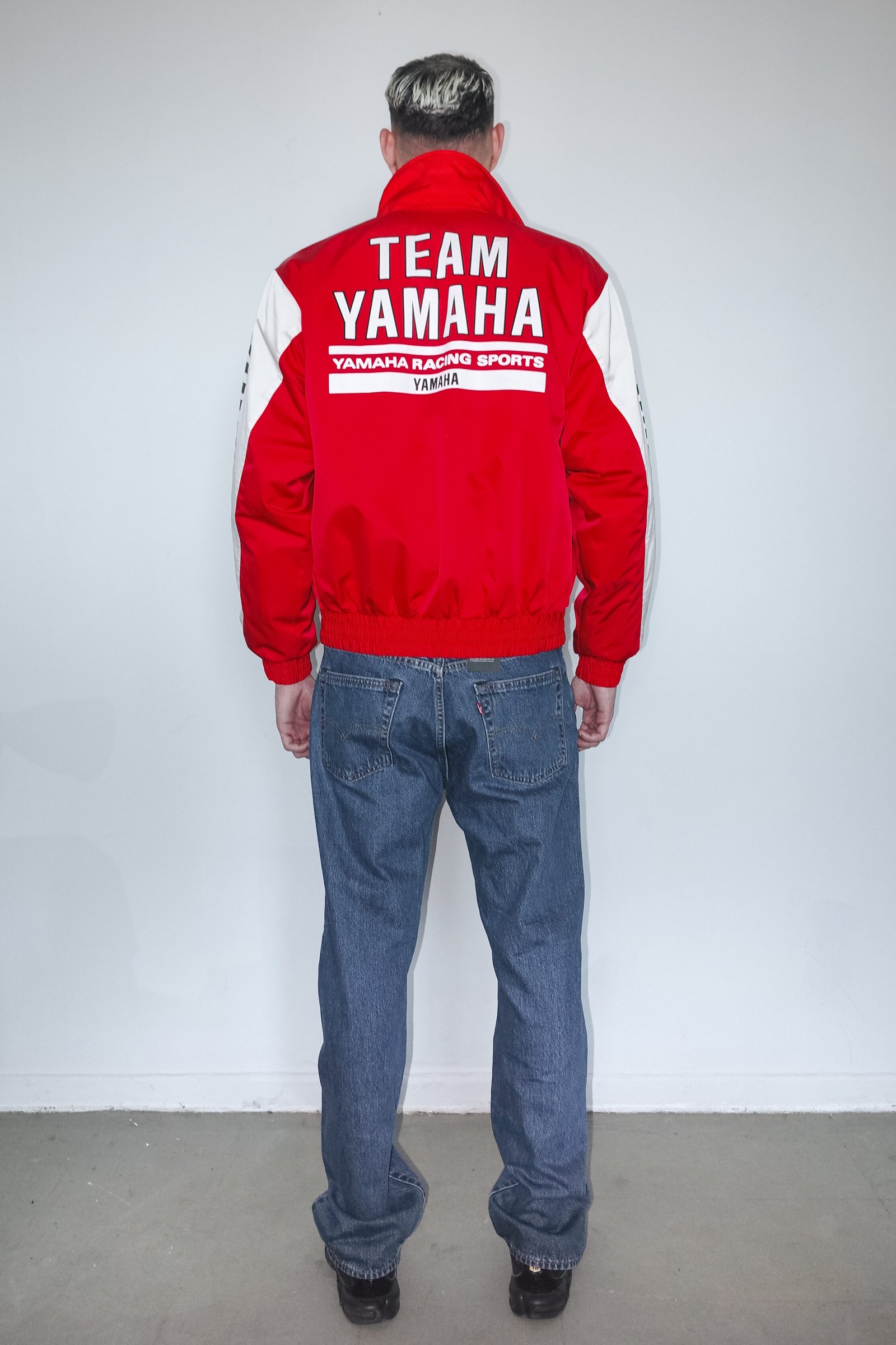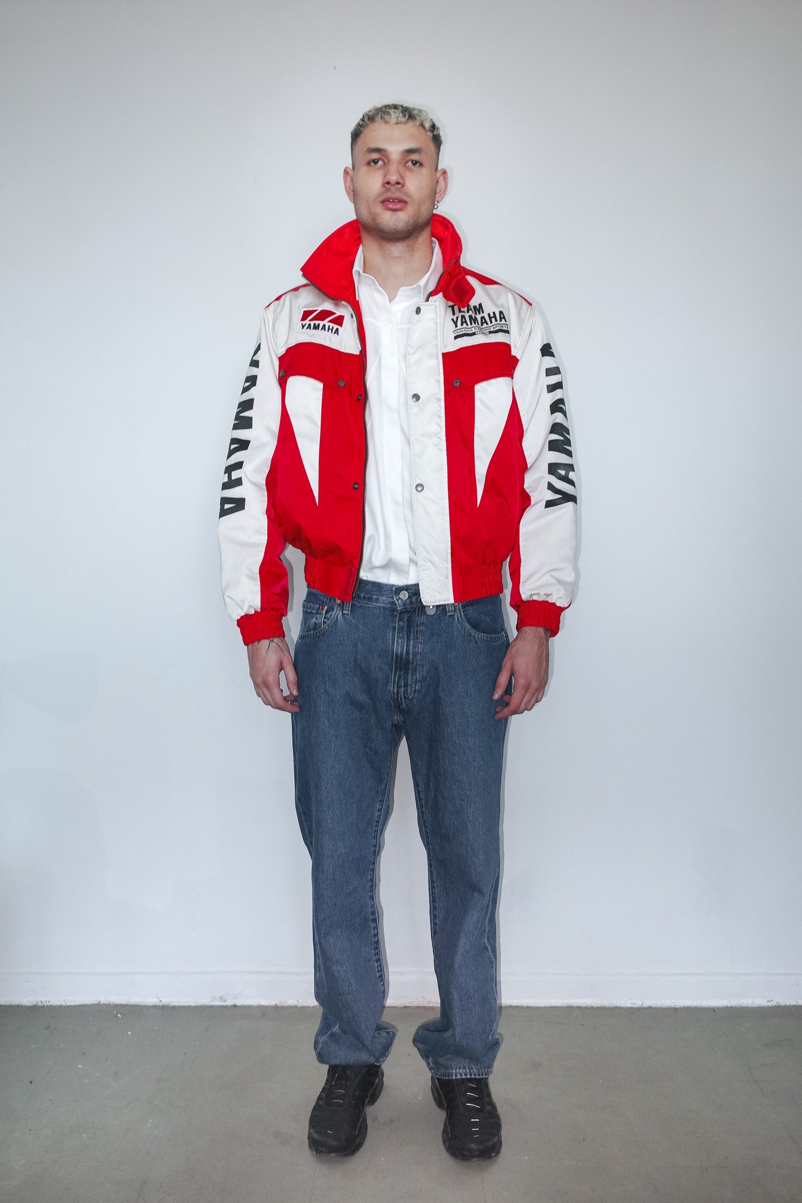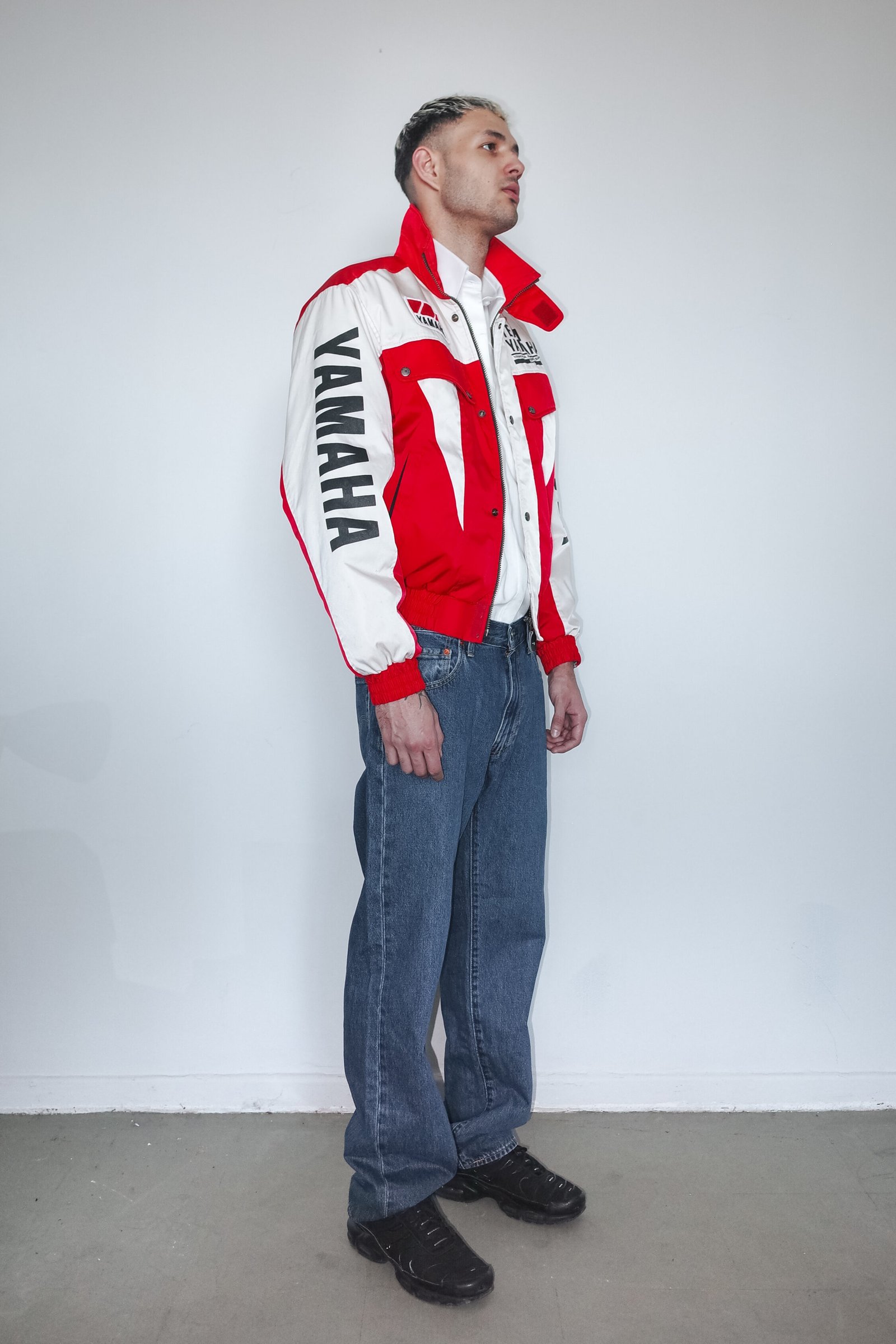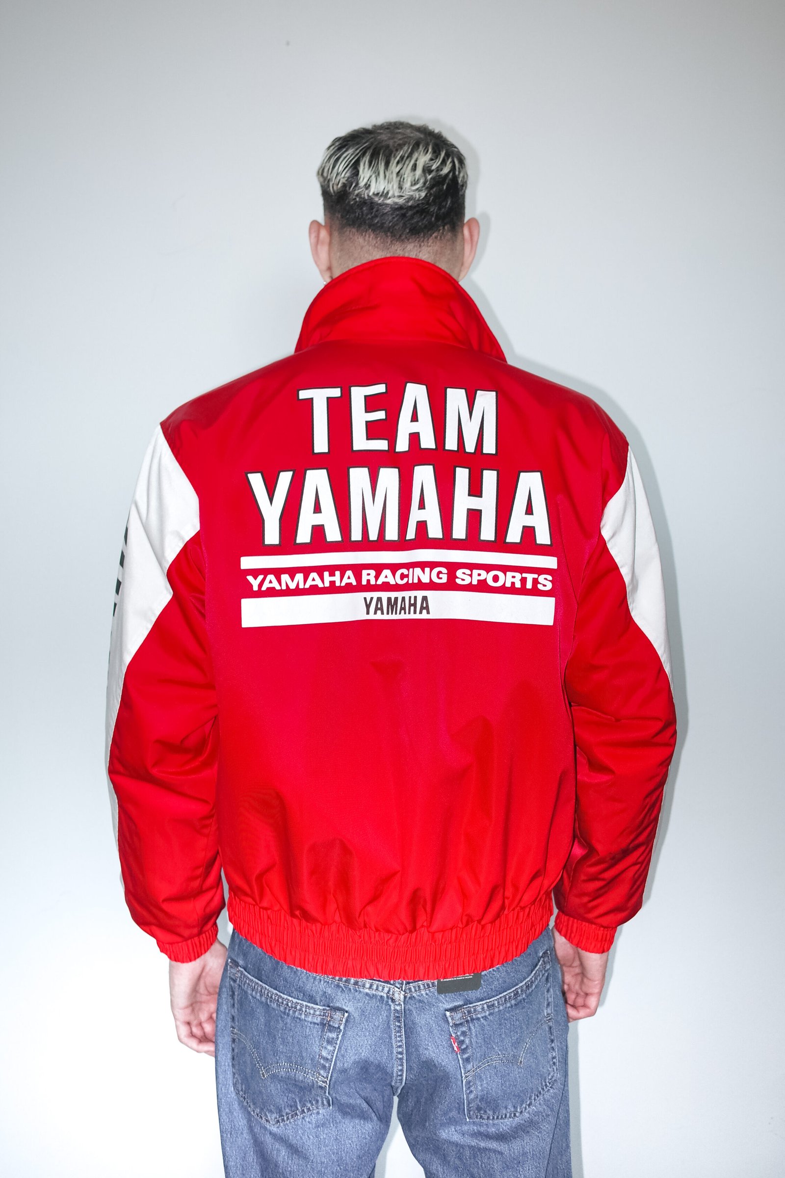 Jaqueta Yamaha com mix de tecidos em couro e sintéticos, nas cores branc e vermelho. Peça com modelagem de jaqueta motociclisram cin punho e barra em elástico. Forrada com cetim. Produto garimpado no Japão.