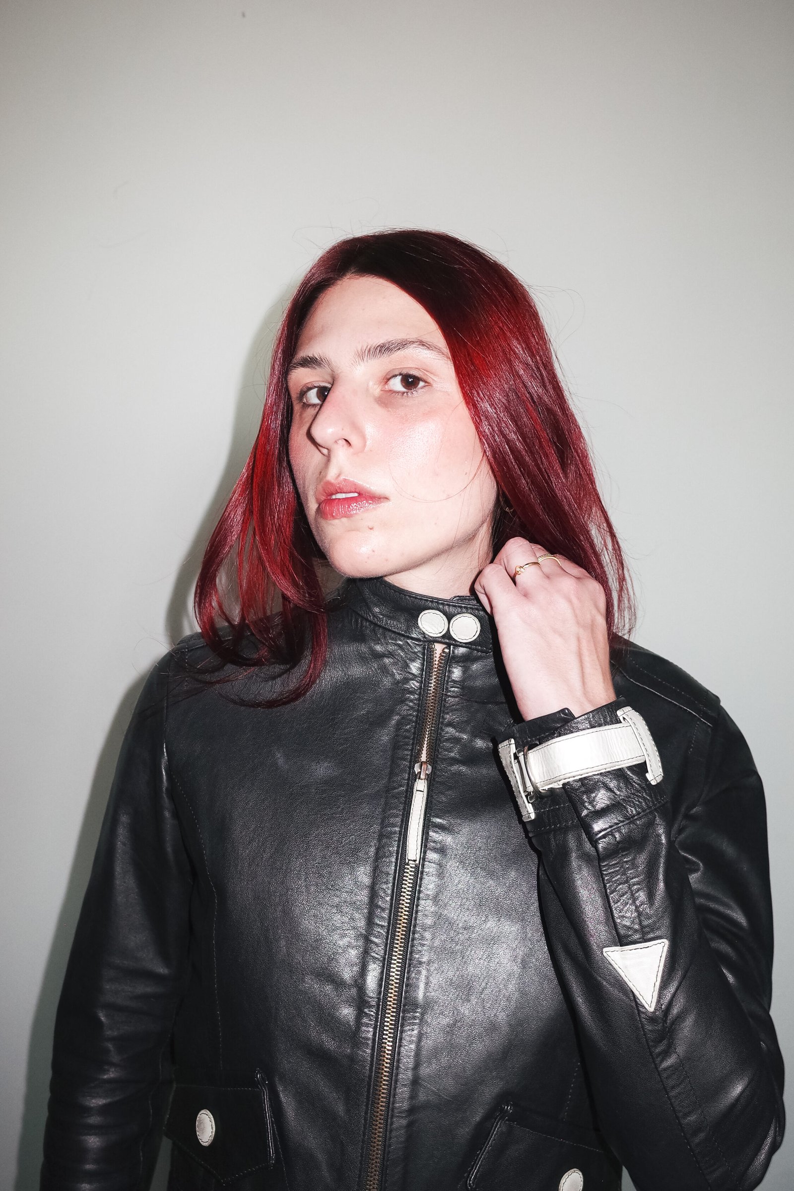 Jaqueta de couro preta com detalhes em creme nos punhos e nos fechos.