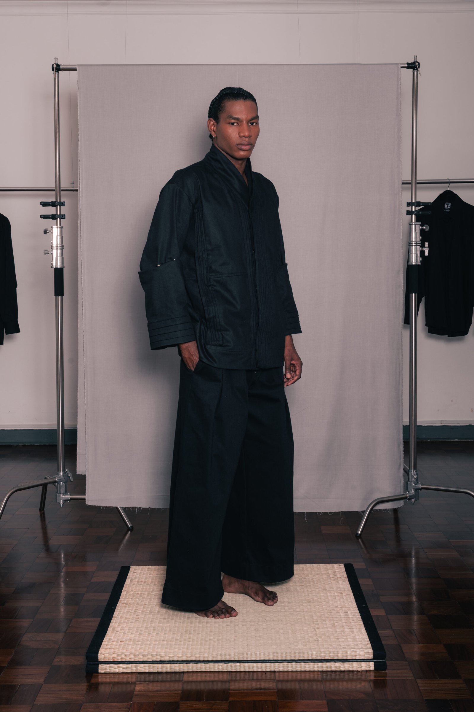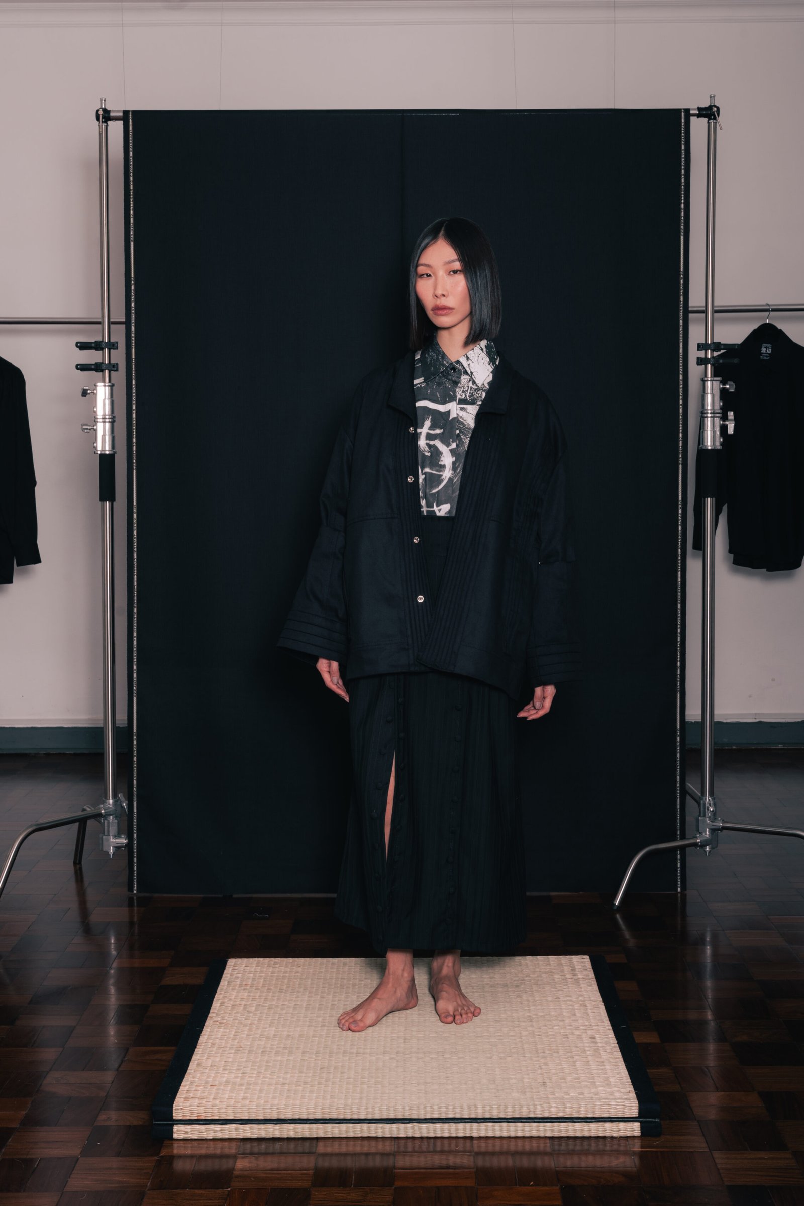 O design destaca um bolso frontal extenso, dividido por costura central em dois compartimentos independentes, além de bolsos laterais funcionais. Nervuras costuradas em linhas paralelas percorrem toda a peça, criando textura e referência visual aos fluxos de pensamento na meditação. As mangas retas possuem ajuste por botões de pressão, permitindo formar pregas estruturais que modificam o caimento conforme a necessidade.