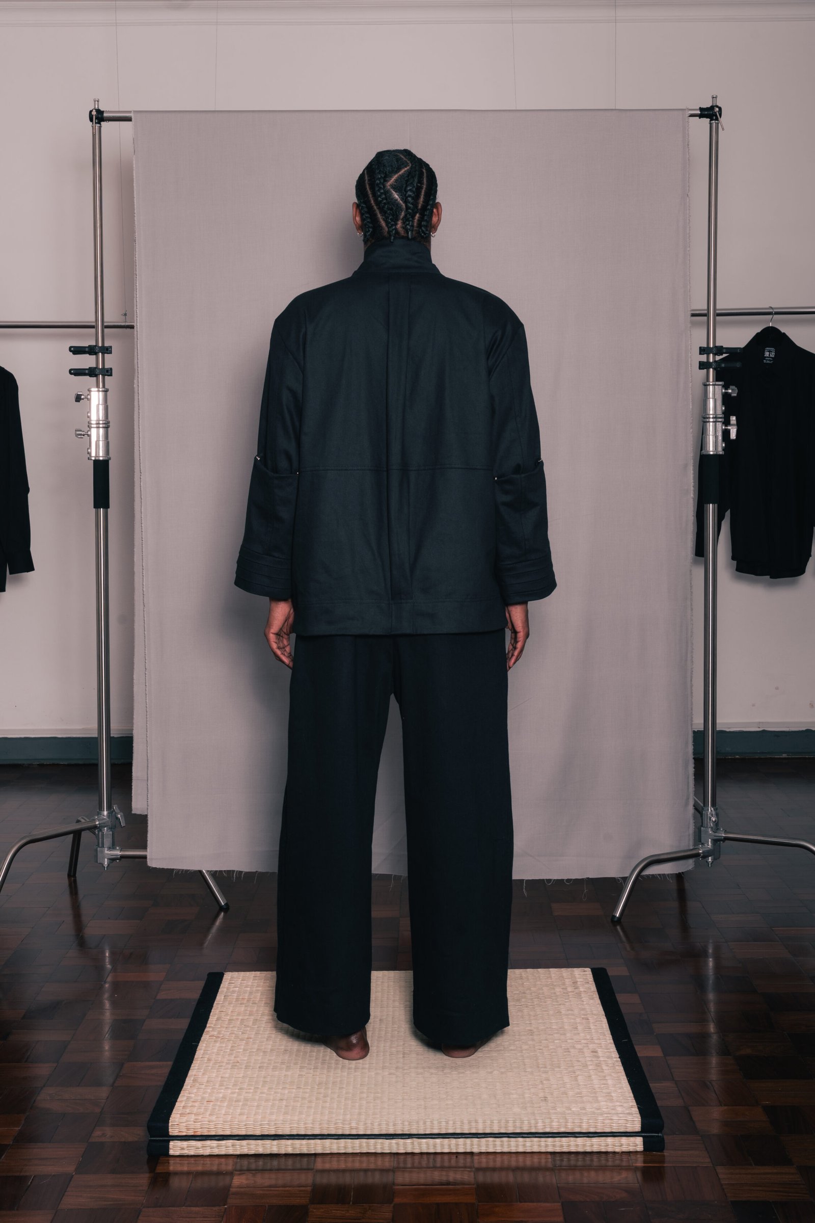 Jaqueta de corte reto, com gola inspirada no tradicional kimono japonês.