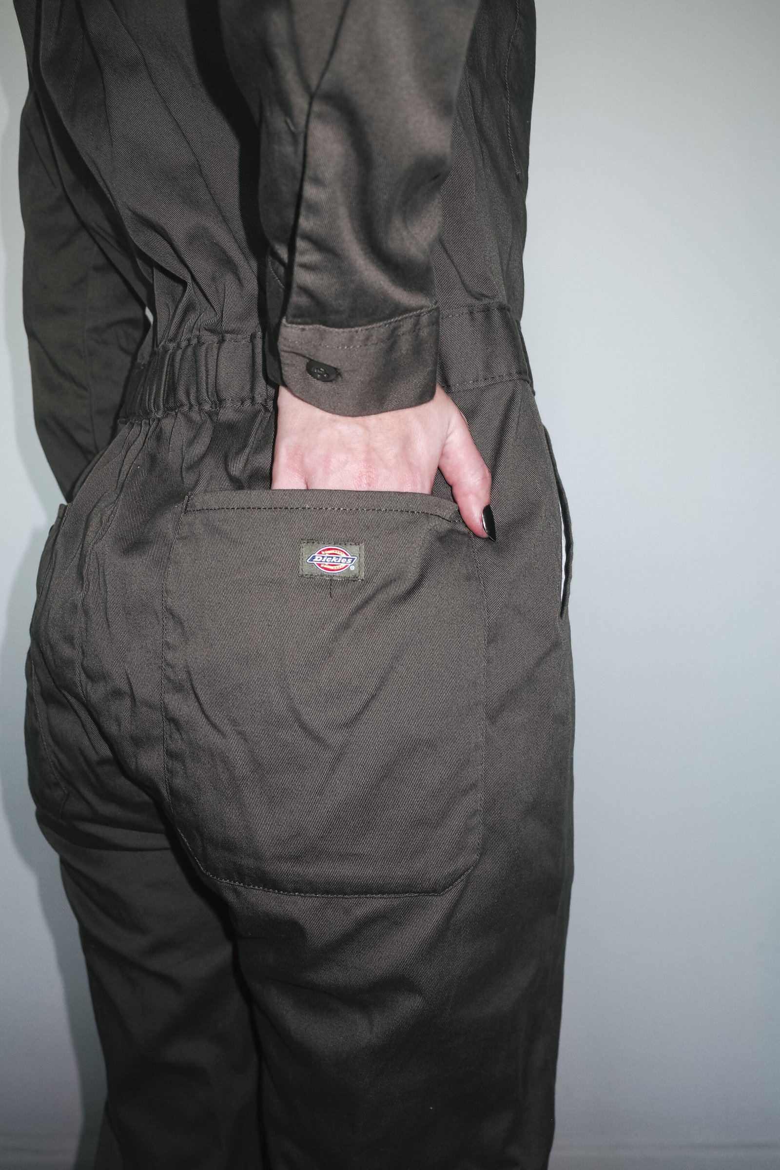 Macacão verde escuro 100% algodão, com mangas longas e bolsos nas laterais. Fecho em zíper e botão de pressão. Marca Dickies.