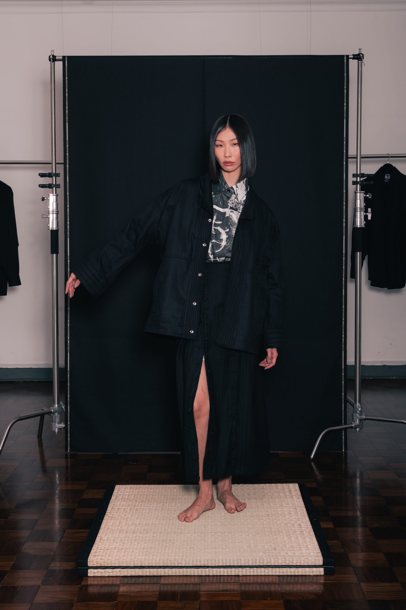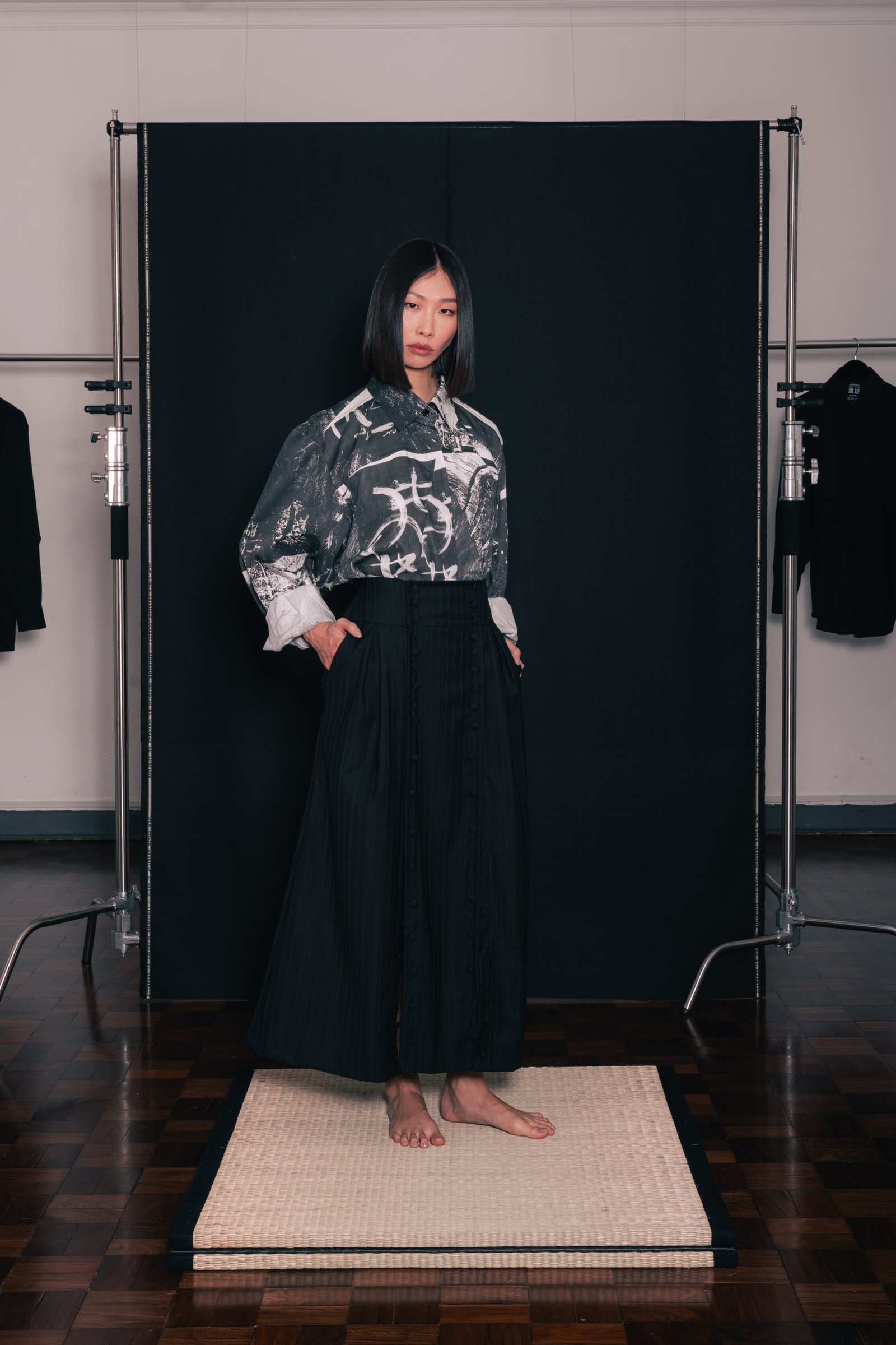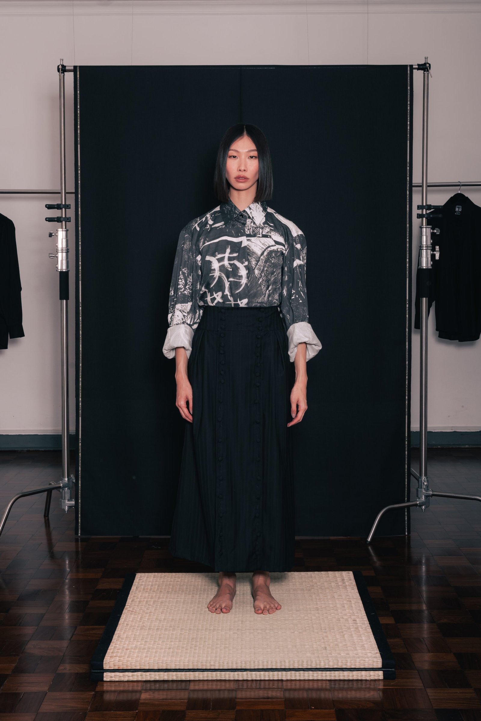 Saia longa de corte reto, com pregas frontais que adicionam movimento e leveza à peça. Conta com botões forrados distribuídos por toda a extensão, permitindo abrir a saia e criar fendas, oferecendo versatilidade no caimento e no styling.
